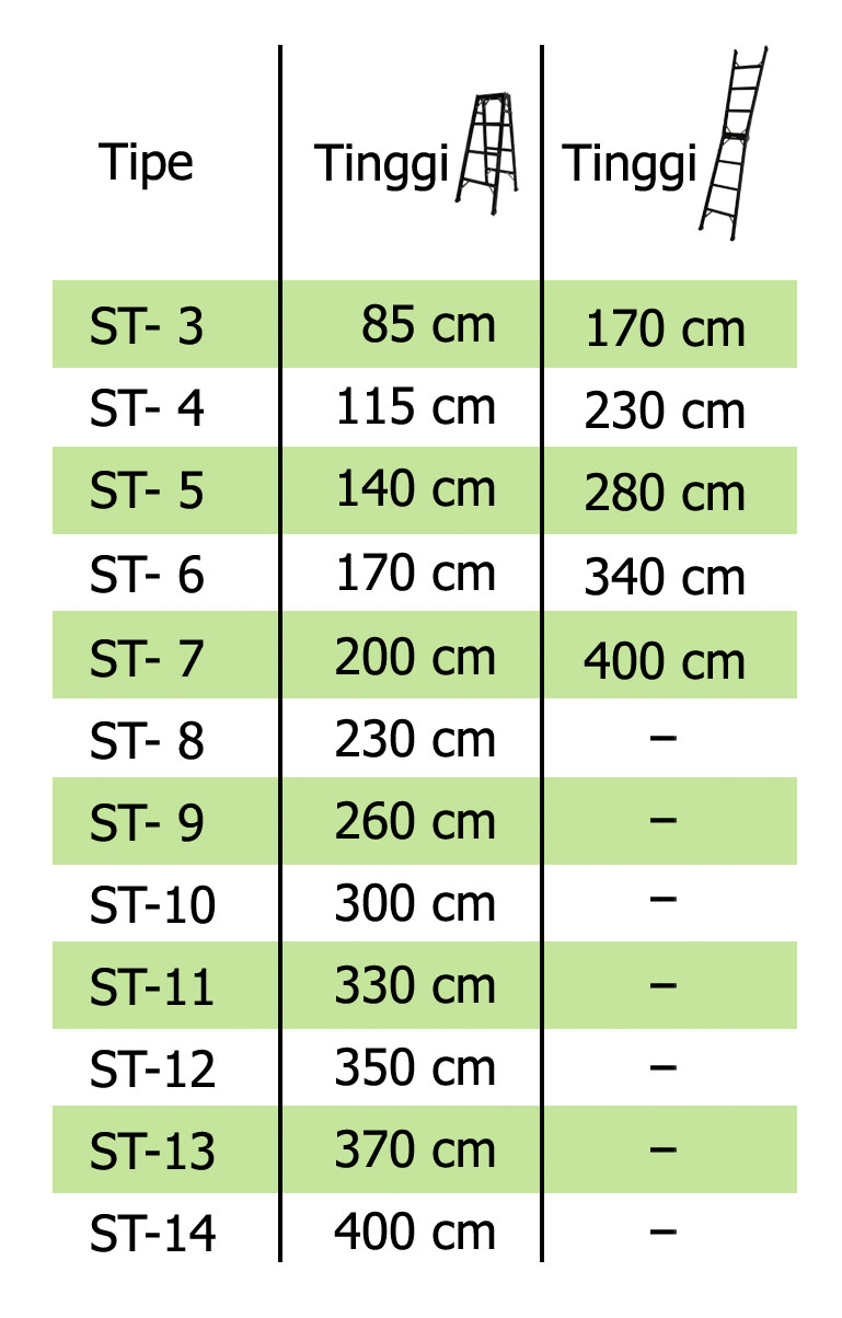 lipat. Material dari aluminium dengan tebal 1.6 mm agar tangga kokoh dan kuat. Serba guna untuk keperluan rumah tangga, niaga, bisnis dan industri, baik indoor maupun outdoor. Terdapat safety lock mechanism sehingga saat tangga dibuka atau diluruskan terkunci dengan kokoh. Kaki tangga dilapisi sepatu karet untuk mencegah selip, juga untuk mengisolasi tangga dari tanah saat bekerja dengan instalasi listrik Beban maksimum sekitar 150 kg (standar untuk 2 orang menaiki tangga secara bersamaan). Tipe ST-3 sampai ST-7 dapat diluruskan untuk menggandakan tinggi. Tipe ST-8 ke atas tidak dapat diluruskan dengan alasan keamanan. |